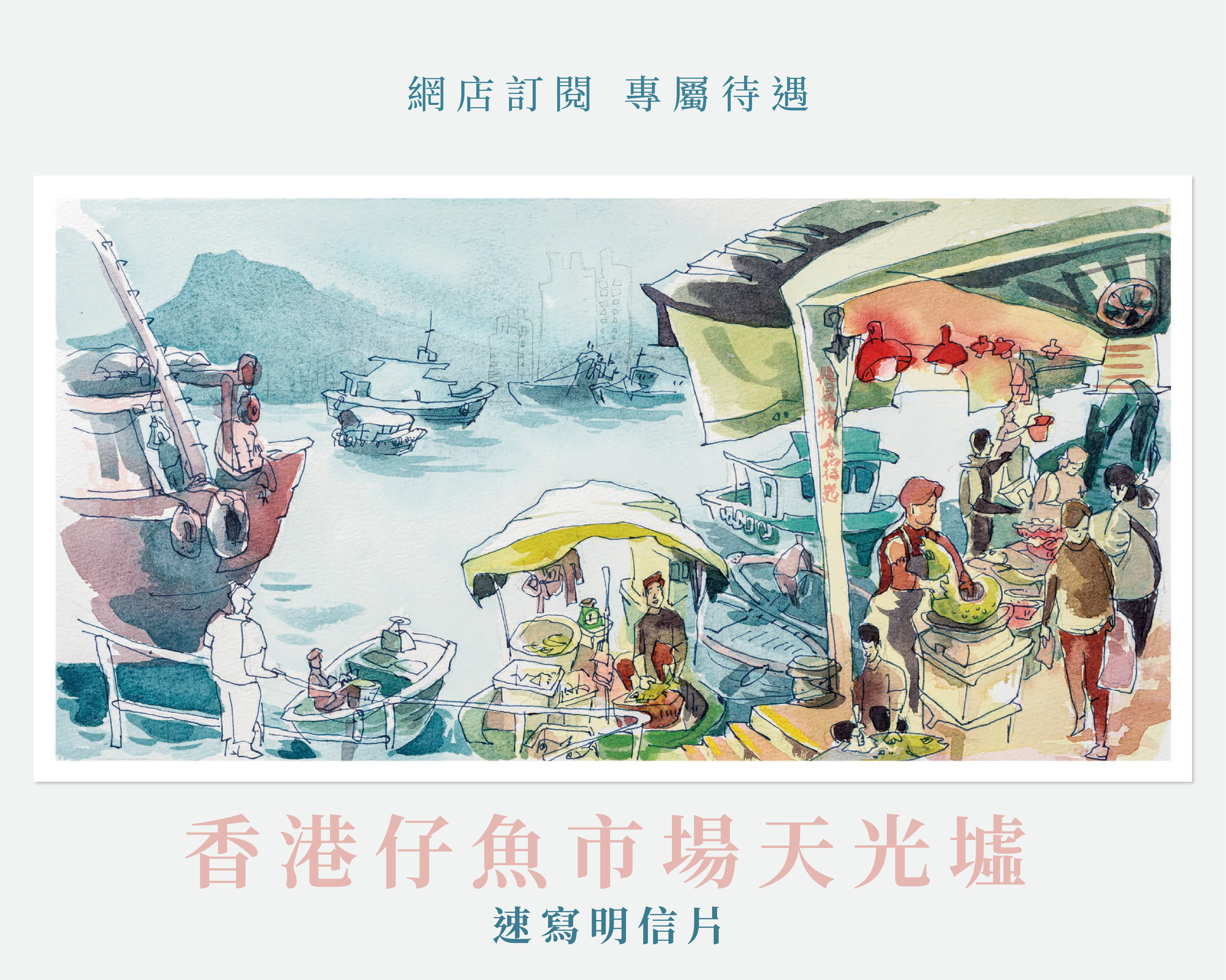 香港仔擁有歷史悠久的漁民文化,除了避風塘和全港規模最大的魚類批發市場外,還有一個早上才營業的天光墟魚市場。漁民會把魚穫拿到岸上攤檔出售,有的更會將船艇停泊在岸邊,出售生猛海鮮,不但價格較便宜,更成為香港仔一大特色。「速寫香港」創辦人之一Ben Luk,用畫筆記錄了由水上延伸到陸上的天光墟魚市場獨特風貌。(數量有限,送完即止)