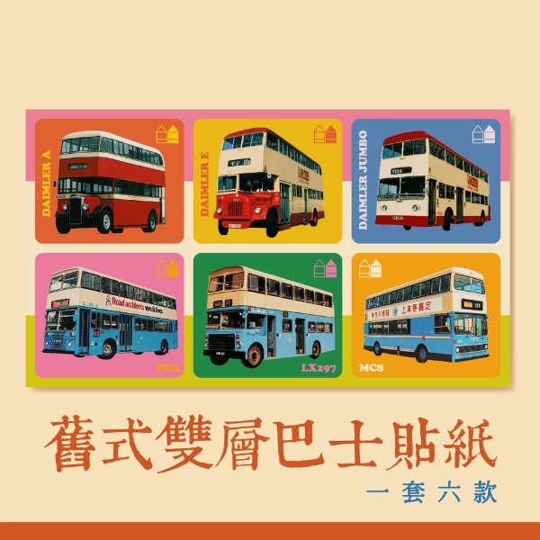 香港第一家巴士公司在1920年代成立,並早於1949年便引進第一部雙層巴士,爾後不但成為全球雙層巴士數量最多的城市之一,九巴和昔日的中巴更曾向英國訂製不同巴士款式。一套六款雙層巴士貼紙,分別來自戰後五十至八十年代,讓人重溫昔日紅藍兩色巴士在港九路上穿梭的日子。