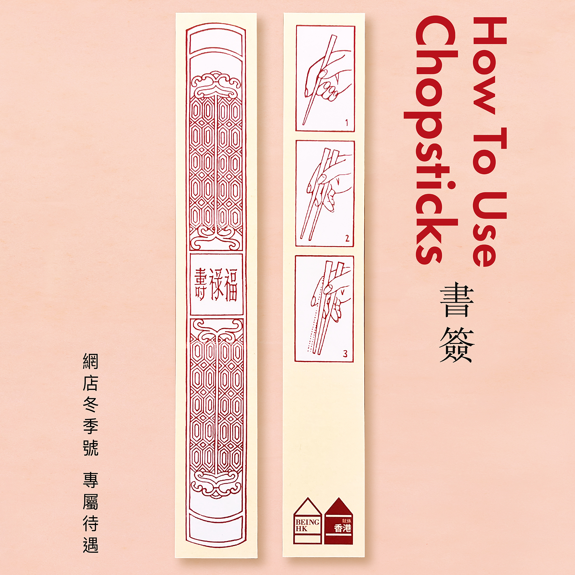 從前的酒樓飯店,經常會用紙套裝著筷子以保衞生,同時印上食肆名字及商標。不少以遊客為對象的中式食肆,更會在紙套印上示範圖,讓外國人學會如何用筷子進食,既實用又增加食中菜的趣味性。書簽正面是中式傳統吉祥圖案,背面則是正確揸筷子三部曲。